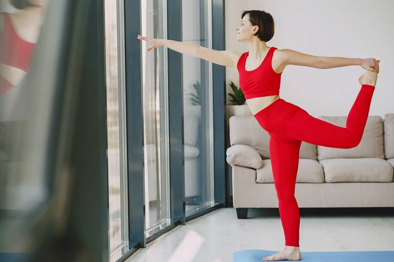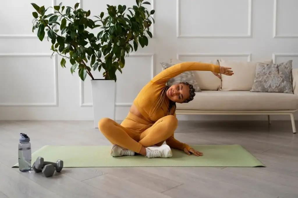 Stelle die Füße hüftbreit, richte den Blick weich und das Brustbein freundlich nach vorne. Atme ein, hebe die Arme nach vorne, atme aus, beuge Hüfte und Knie, als würdest du dich auf einen unsichtbaren Hocker setzen. Halte Länge im Rücken, drücke dich über die Füße kraftvoll nach oben. Drei bis fünf ruhige Wiederholungen reichen. Du aktivierst Beinachsen, stabilisierst das Becken und gibst dem Kreislauf einen klaren Wachimpuls.